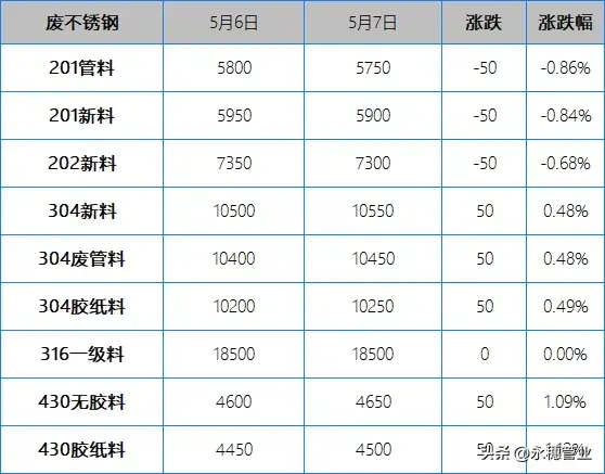 不銹鋼水管制管坯料早間挺價午后現“低價”;201廢料跌50元/噸