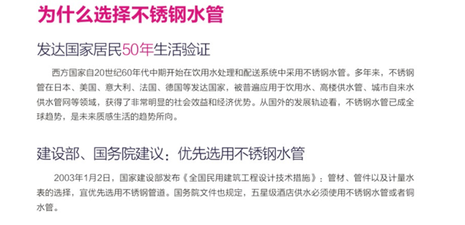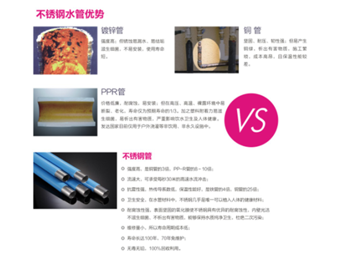 4.衛生安全,在水管材質中,不銹鋼是公認可以植入人體的健康材料;